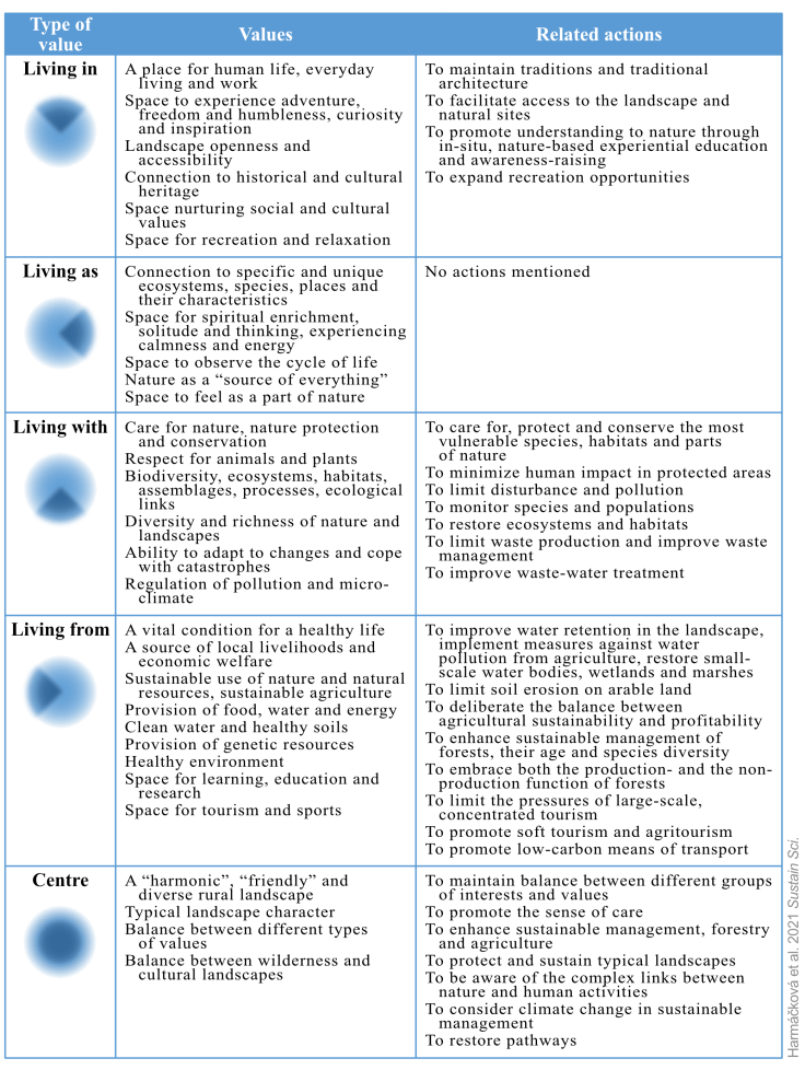 Tento přístup nám pomohl propojit vnitřní hodnoty účastníků s konkrétními rozhodnutími a aktivitami, které utvářejí místní krajinu i společenství a ovlivňují budoucí vývoj chráněných oblastí. Zjištěných typů hodnot byla celá škála, zahrnující např. udržení tradic, ochranu a obnovu přírodních ekosystémů nebo vytvoření prostoru pro místní rozvoj a místní zdroje obživy. Zvláště zajímavé bylo zjištění, že účastníci považovali za klíčovou rovnováhu mezi různými typy hodnot a uváděli široký rozptyl aktivit od obecnějších a strategických po konkrétněji zaměřené (další příklady a detaily uvádíme v tabulce na konci textu).