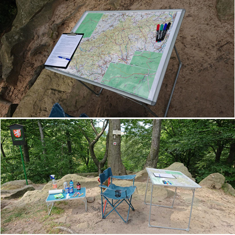 Obrázek 1 – Vlevo průběh skupinové diskuse focus group v Chřibech. Vpravo zákresy v mapě studovaného území Chřibů.