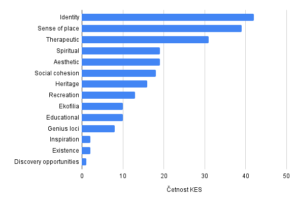 Během července a srpna 2020 bylo sebráno celkem 166 dotazníků, z nichž 123 bylo získáno od opakovaných návštěvníků, kteří vyplnili celý dotazník. Data byla následně analyzována a nakódována do zobecněných kategorií KES. Níže představujeme 3 dílčí výsledky: 1) KES jako důvody, proč lidé chodí do Chřibů (Graf 1); 2) KES jako pocity a emoce, které mají lidé spojeny s určitými místy (Graf 2); 3) mapa míst, která respondenti využívají za účelem estetických prožitků (Obrázek 3).