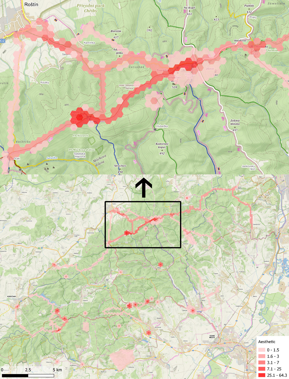 Mapa níže (Obrázek 3) ukazuje prostorové zachycení odpovědí respondentů vztahujících se ke konkrétním místům, trasám nebo oblastem v území, které jsou vyhledávány za účelem estetických prožitků (Aesthetic). Evidentní je návaznost na turisticky dobře dostupná místa spojená s nějakou atrakcí nebo výhledem. Na výřezu mapy tak vyniká turistická trasa po hřebeni s občasnými vyhlídkami do krajiny a rozhlednou Brdo na nejvyšším bodě Chřibů. V kontextu celých Chřibů se jako významná místa pro estetické prožitky objevuje např. hrad Buchlov, zřícenina hradu Cimburk nebo zámecký park v Buchlovicích.