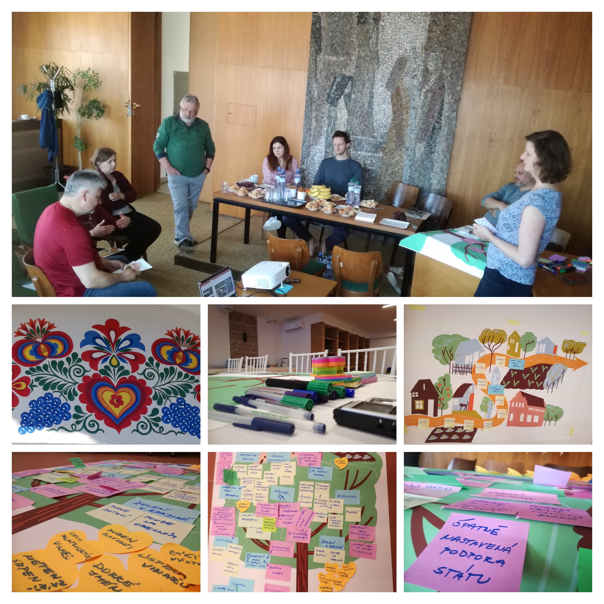 The aim of the second phase of Just Scapes was to present our findings to the wider public and to gather the public’s opinions in order to broaden our knowledge of the current situation in the research areas. We spent a week amongst the people people in two regions of South Moravia, Slovácko and Horňácko, and a region in East Moravia, Valašsko. Together with the local municipalities and community leaders, we held five participatory workshops on issues important for the landscape and the communities in the research areas. We presented our summer field trip results to our participants (see more here: https://sustainablecz.org/2021/10/12/just-landscape-transformation-in-the-perspective-of-people-from-slovacko-moravian-slovakia-and-valassko-moravian-wallachia-regions/) and then discussed these findings with them. Each workshop took place in a different municipality and on a different day. The participants came from various sectors; there were local government members, farmers, vintners, gamekeepers, NGO members, activists, and locals.