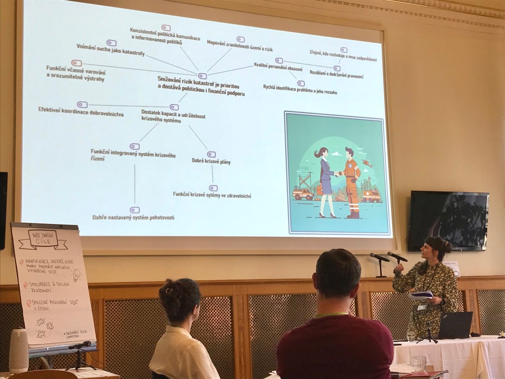 První část workshopu byla věnována představení výsledků dosavadního výzkumu resilienčního myšlení v kontextu snižování rizik katastrof, s nimiž přítomné podrobně seznámila Anna Bromová. V rámci předchozího participativního workshopu, kterého se v listopadu 2023 účastnilo třináct aktérek a aktérů snižování rizik katastrof, byla pro celý výzkum sesbíraná důležitá vstupní data. Na jejich základě pak byla sestavena vize toho, jak by mohlo v českém kontextu vypadat úspěšné zvládání katastrof v budoucnosti. Výzkumný tým, mimo jiné s pomocí reflexivní tematické analýzy dat z prvního setkání, rozpracoval následující vizi sestávající z osmi částí: