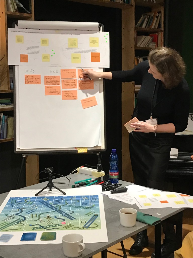 Právě na tuto fázi výzkumu pak navázal aktuální, druhý workshop. Výzkumný tým nejprve vybral ty nejvlivnější zpětnovazební smyčky, které FCM mapy vytvořené na prvním workshopu tzv. poháněly. Po detailním popisu těchto smyček se následně účastnice a účastníci rozhodli, se kterou ze smyček chtějí pracovat, a tak vznikly dvě skupiny – jedna se zaměřením na působení spíše tzv. top-down faktorů (např. lobbying a politická podpora) a druhá naopak na působení tzv. bottom-up faktorů (např. propojování producentů s konzumenty nebo vliv malých hráčů.) Na základě těchto zpětnovazebních smyček, resp. mechanismů transformativní změny, se účastnice a účastníci zamýšleli nad konkrétními opatřeními (intervencemi), jimiž by bylo možné dynamiku těchto smyček využít a podpořit hybné síly s transformativním potenciálem. K podnícení diskuse využil výzkumný tým i některé inovativní metody s herními prvky, například mechanismus hry Hadi a žebříky, obohacený ale o potenciální příležitosti a bariéry, jež by mohly mít na vývoj daných sektorů vliv. Z takto sesbíraných podnětů a aktivit následně účastnice a účastníci workshopu, opět ve skupinách, vytvářeli chronologicky či kauzálně provázané sekvence již vymyšlených opatření, tedy tzv. “pathways” mající potenciál transformovat dané sektory.