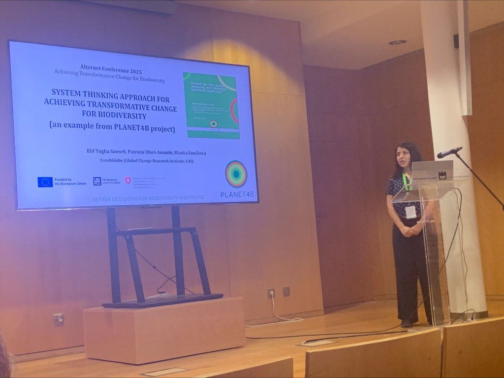 Elif Tugba Simsek, a postdoctoral researcher from the same department, also delivered a presentation on the system thinking approach for achieving transformative change for biodiversity based on the PLANET4B project. The presentation focused on a recent report of the project, “System Mapping and Leverage Points for Each Case,” prepared by Blanka Loučková, Elif Tugba Simsek and Patricia Ofori-Amanfo. The report synthesised findings from five place-based and six sector-based case studies, identifying key leverage points and insights from local communities and sectors that can drive meaningful change. The case studies span different countries, including Norway, Austria, the UK, Germany, Switzerland, Hungary, and Italy, and the sectors examined are fashion, financial investments, global soy and beef trade, education, and agrobiodiversity. The presentation specifically focused on the findings from five place-based case studies: Nature Recreation in Oslo, Urban Youth in Germany, Edible City and Inclusion in Graz, Opening Nature to Black, Asian, and Ethnic Minority Communities, and Attitudes towards Agro-biodiversity and Religion in Switzerland. It emphasised the importance of inclusive decision-making and leveraging local knowledge to create context-specific solutions based on the report’s findings.