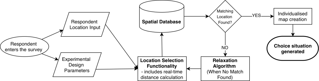 To keep experimental control—so we can systematically vary spatial and non-spatial characteristics while still using real sites—an algorithm selects locations that match the target levels from the experimental design (including distance). When an exact match is not possible, the algorithm relaxes constraints step-by-step to find the closest feasible sites. Together, this functionality (see figure 2) makes choices more realistic while creating a unique dataset with substantial variation in spatial factors, enabling us to study spatial effects at national scale.