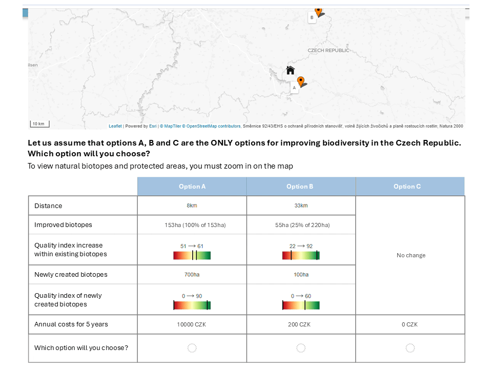 We combined a large GIS database of potential biodiversity policy sites with a survey functionality specifically developed to generate realistic, respondent-specific, map-based choice tasks. In each task, people choose between two policy options (A and B) and a “no change” option—but crucially, A and B are actual locations displayed on a map, together with the respondent’s home location.