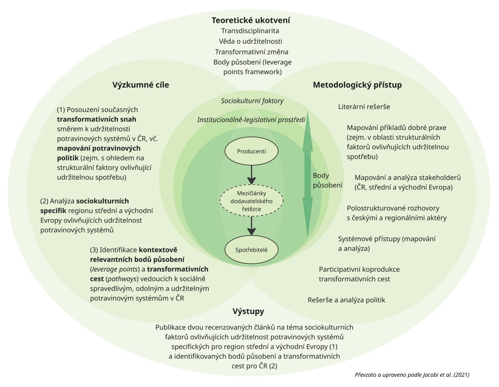 Druhým cílem je prozkoumat specifické sociální a kulturní faktory, které ovlivňují transformaci potravinových systémů v zemích střední a východní Evropy. Třetím cílem je následně identifikovat kontextově relevantní body působení (tzv. leverage points) a transformativní cesty (tzv. transformative pathways), které mohou pomoci nasměrovat Česko ke spravedlivějším, odolnějším a udržitelnějším potravinovým systémům.