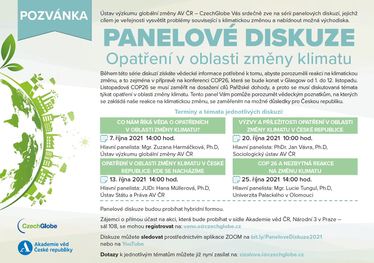 Ústav výzkumu globální změny AV ČR – CzechGlobe Vás srdečně zve na sérii panelových diskuzí, jejichž cílem je veřejnosti vysvětlit problémy související s klimatickou změnou a nabídnout možná východiska.
